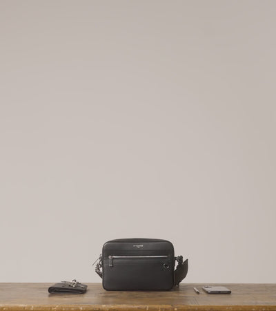 Camera bag marqué Le Tanneur avec portebadge amovible et éléments métalliques finition argent. Porté main, épaule ou croisé grâce à sa bandoulière ajustable et amovible.