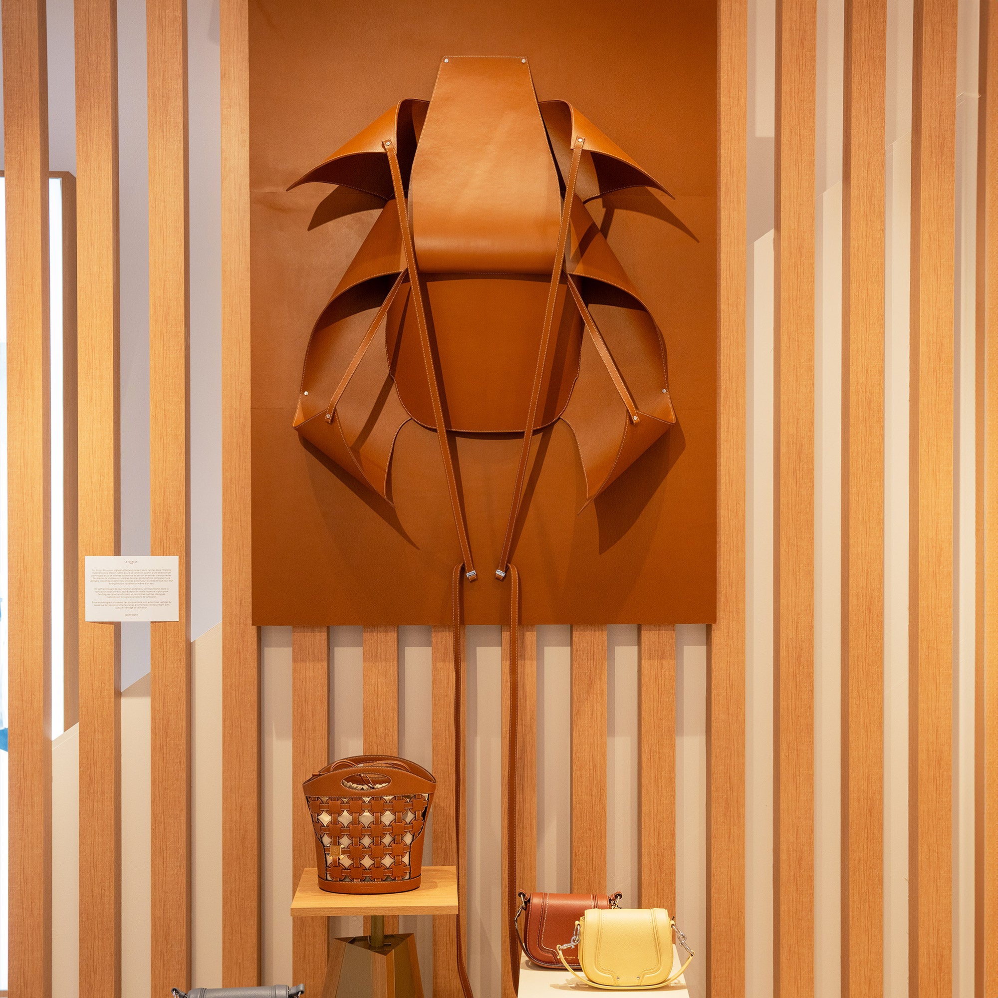 Pour l’ouverture, nous avons à nouveau collaboré avec le duo de designers dach&zephir. Ils ont imaginé une œuvre intitulée Les Vestiges Recomposés, réalisée à partir d’une sélection de patronages issus de différentes collections de sacs et de petite maroquinerie.