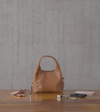 Ce petit sac à main souple, en cuir lisse et aux lignes sans découpe, arbore un charms T finition doré clair signature de la Maison. Il se porte à la main, à l'épaule ou croisé avec sa bandoulière amovible.